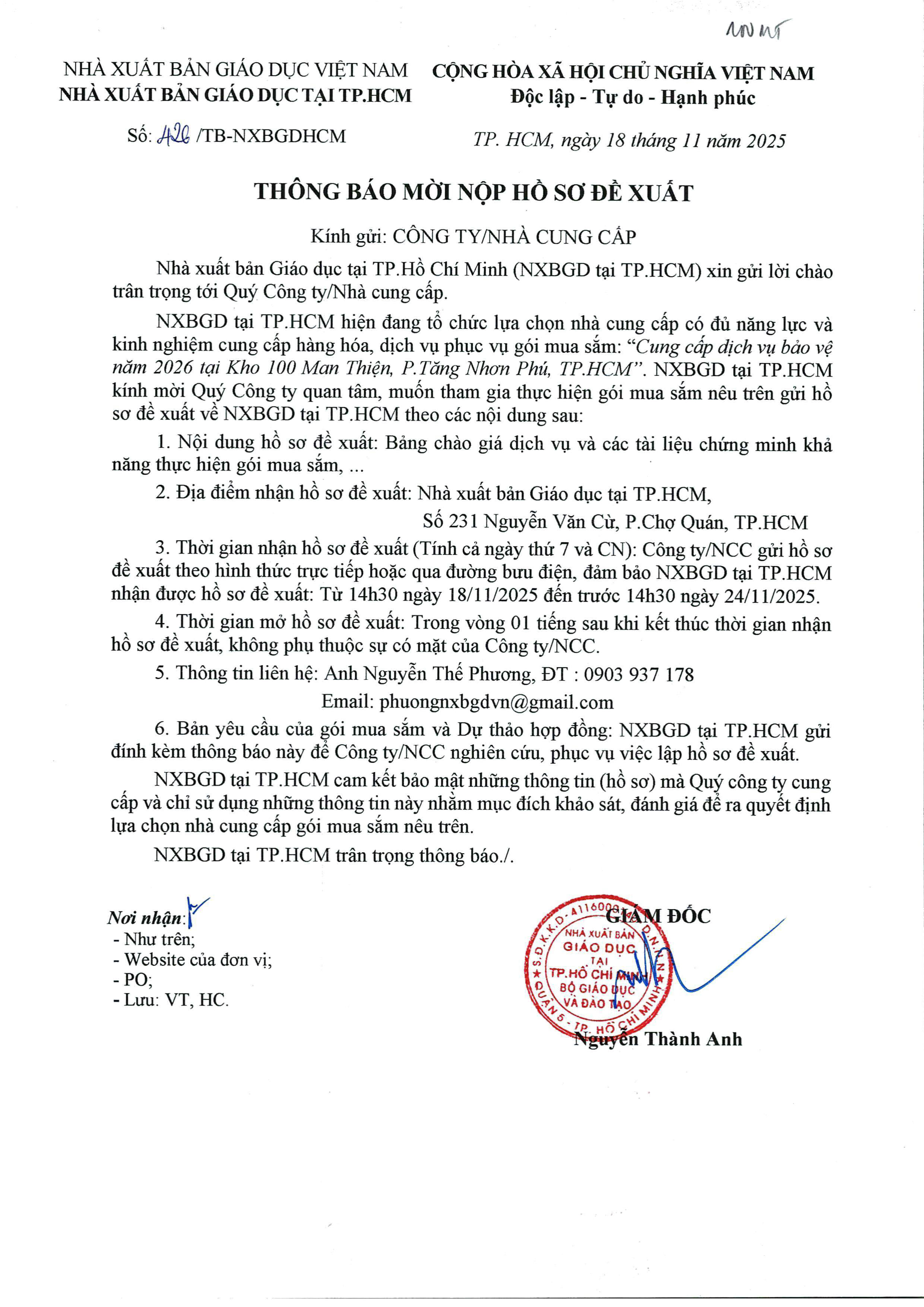Thông báo Mời nộp hồ sơ đề xuất – Cung cấp dịch vụ bảo vệ năm 2026 tại Kho 100 Man Thiện, P. Tăng Nhơn Phú, TP. Hồ Chí Minh