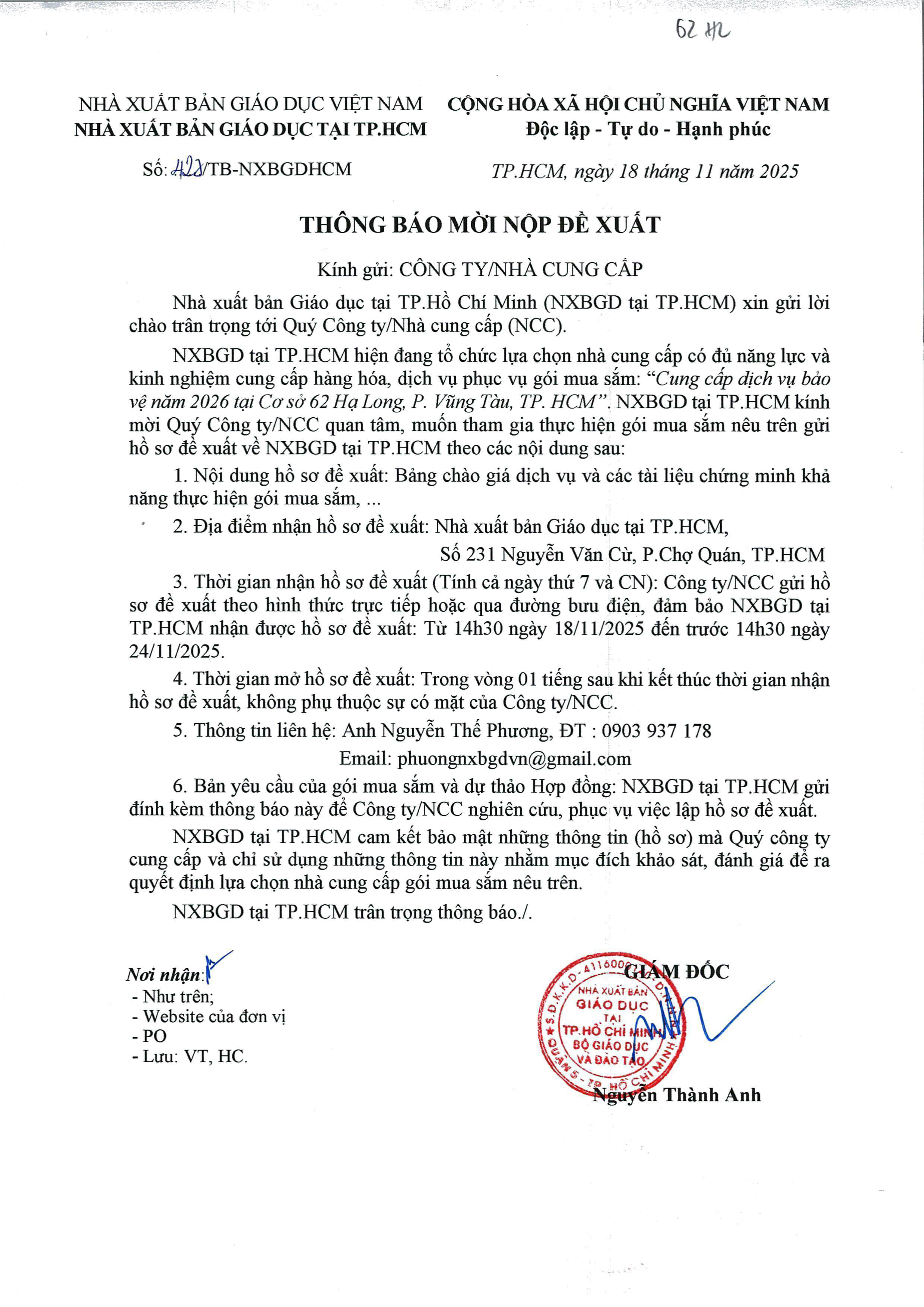 Thông báo Mời nộp hồ sơ đề xuất – Cung cấp dịch vụ bảo vệ năm 2026 tại cơ sở 62 Hạ Long, P. Vũng Tàu, TP. Hồ Chí Minh