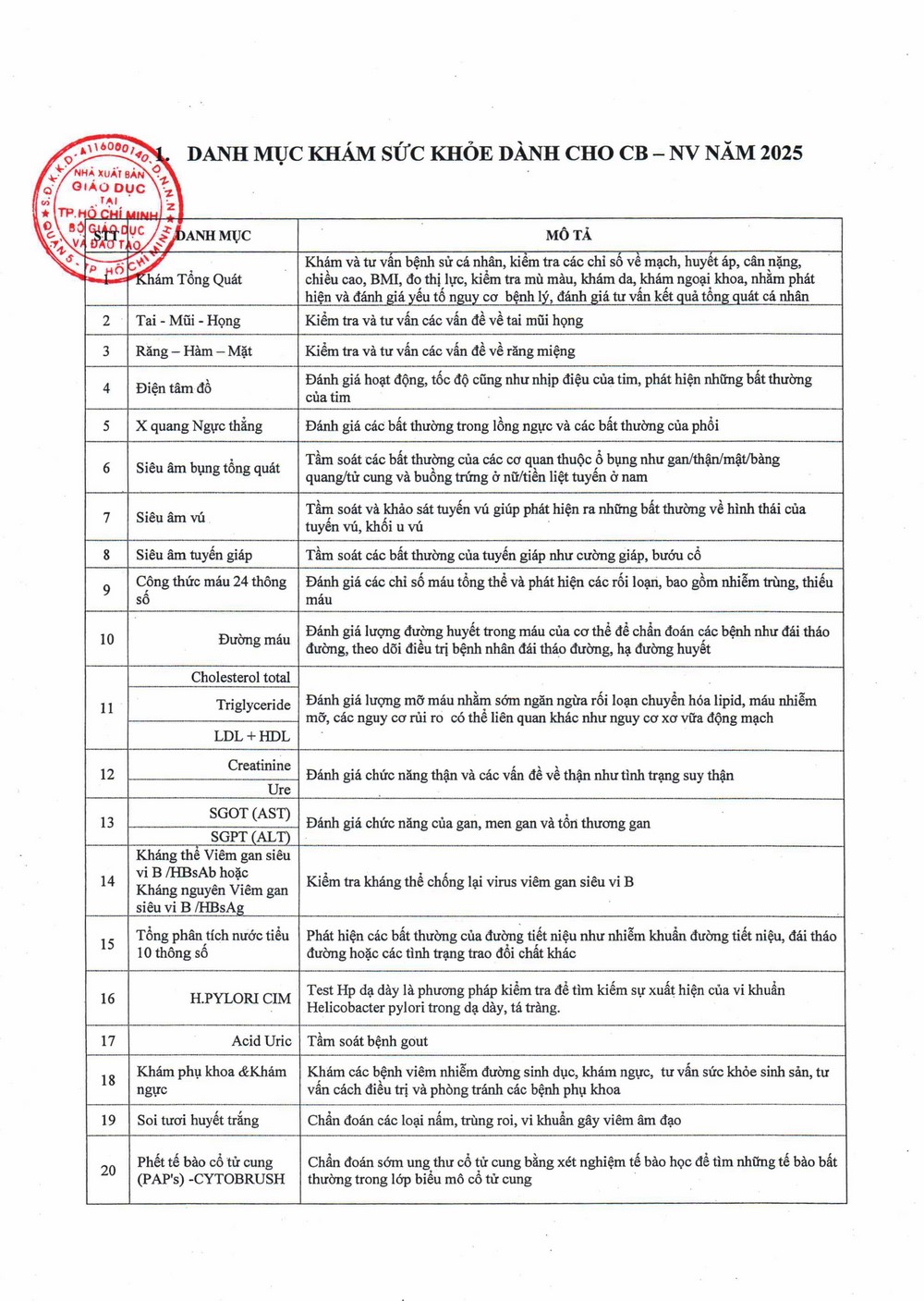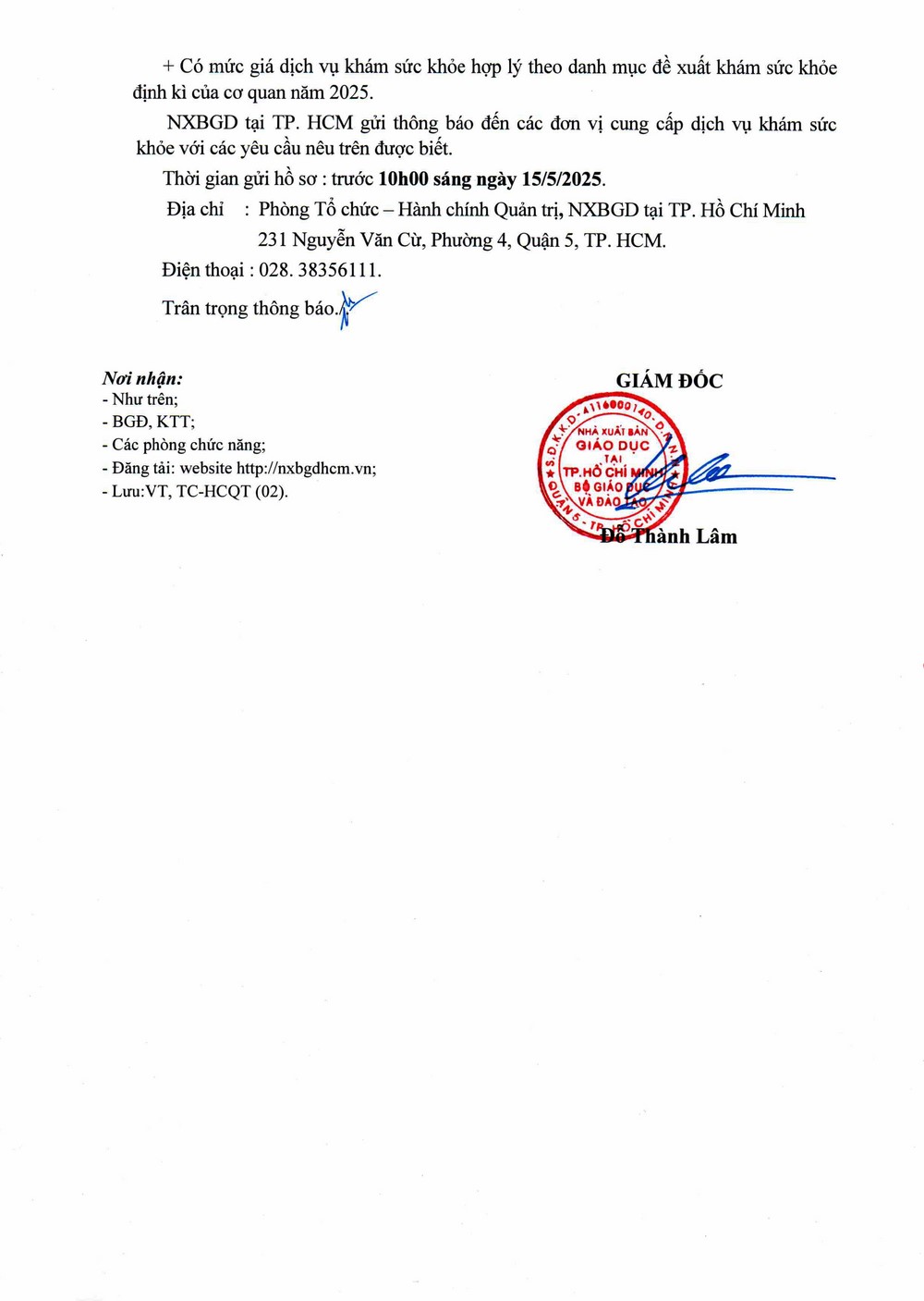 Kính gởi Anh/Chị phụ trách KSK Nhà Xuất Bản Giáo Dục TP HCM . Bệnh Viện Sante đã nhận được thông tin của Quý công ty. Báo giá sẽ gửi đến cho Quý Công ty sớm nhất có thể .Rất mong dược đồng hành cùng Quý Doanh Nghiệp trong mùa chăm sóc sức khỏe nhân viên năm nay.